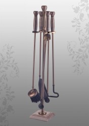 Stylowy zestaw kominkowy wykonany z mosiądzu patynowanego (brąz). Wszystkie elementy są lakierowane w celu uniknięcia utleniania się mosiądzu, przez co metal nie zmienia koloru. Zestaw kominkowy składa się z czterech elementów: