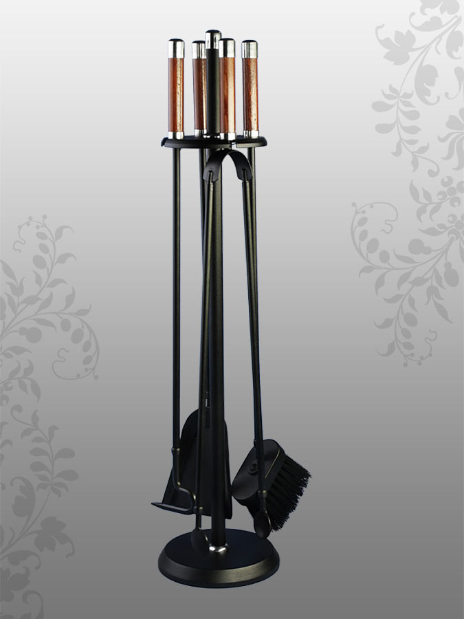 Stylowy zestaw kominkowy wykonany ze stali malowanej proszkowo na kolor czarny. Rękojeści drewniane pokryte lakierem z zakończeniami chromowymi. Zestaw składa się z czterech elementów: