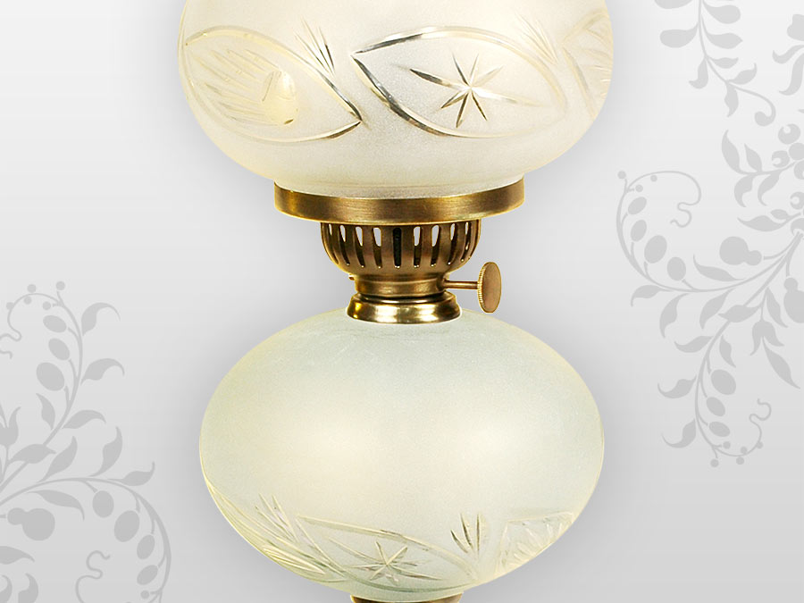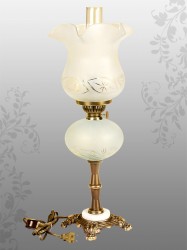 Stylizowana lampa naftowo - elektryczna (110V/220V) wykonana z mosiądzu patynowanego (brąz). Wszystkie elementy są lakierowane w celu uniknięcia utleniania się, przez co metal nie zmienia koloru. W podstawę wkomponowany jest marmur o kolorze jasnokremowym ”BRECCIA” (części marmurowe mogą być wykonane z dowolnego koloru). Elementy szklane, klosz oraz pojemnik na naftę są wykonane z wysoko jakościowego szkła o kolorze matowym ręcznie szlifowanym. Lufka szklana jest hartowana, co powoduje dużą odporność na wysokie temperatury.